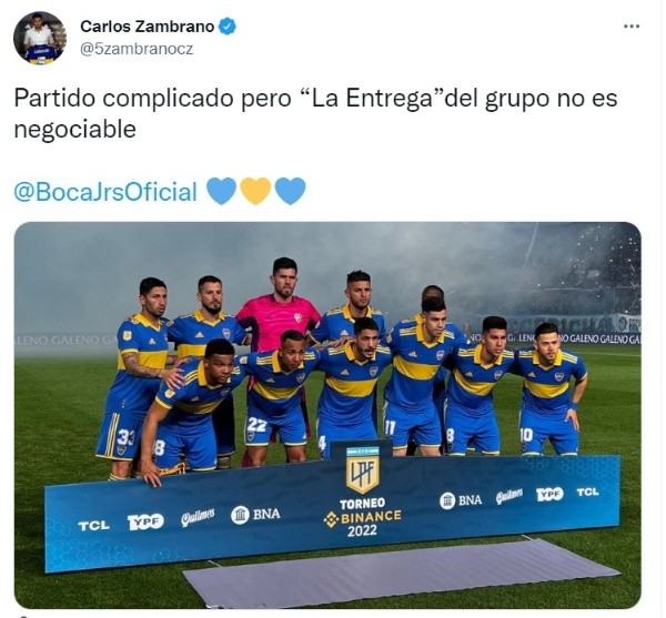 “Partido complicado pero ‘La Entrega’ del grupo no es negociable“, colocó el defensor peruano en sus redes sociales tras la pelea con Darío Benedetto. Carlos Zambrano se volcó a su Twitter para mandar un mensaje que resulta enigmático,