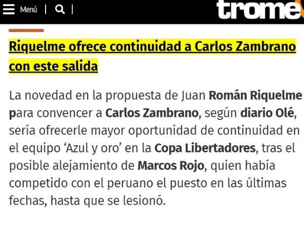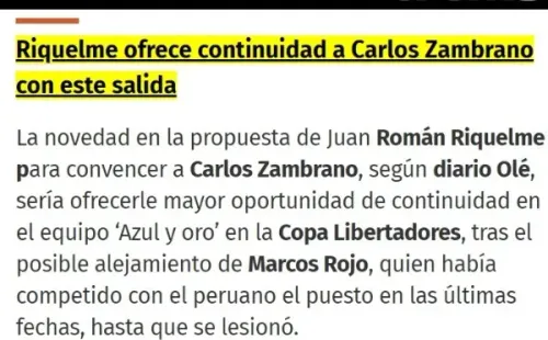 “La novedad en la propuesta de Juan Román Riquelme para convencer a Carlos Zambrano, según diario Olé, sería ofrecerle mayor oportunidad de continuidad en el equipo ‘Azul y oro’ en la Copa Libertadores, tras el posible alejamiento de Marcos Rojo, quien había competido con el peruano el puesto en las últimas fechas, hasta que se lesionó”, aseguró el diario Trome.