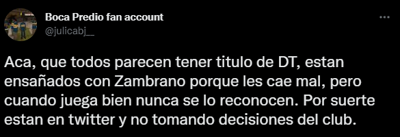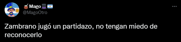 Como broche de oro, un cariño extra para el representante peruano, por parte de un seguidor en Twitter con importante número de seguidores: “Acá, que todos parecen tener título de DT, están ensañados con Zambrano porque les cae mal, pero cuando juega bien nunca se lo reconocen. Por suerte están en Twitter y no tomando decisiones del club”. Bien por nuestro crack, Juan Reynoso debe estar orgulloso.