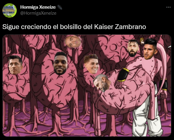 Uno de ellos dice: “Sigue creciendo el bolsillo del Káiser Zambrano”, dentro de la gráfica podemos ver al ‘León’ como Majim Boo, junto a los rostros de sus principales víctimas: Robert Lewandowski, Miguel Borja, Julián Álvarez, Lucas Pratto, entre otros. Dentro se puede ver también al reciente ‘Licha López’, quien casi ni se pudo mover en la última jornada contra ‘el xeneize’, cortesía de Carlos Zambrano.