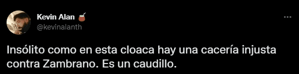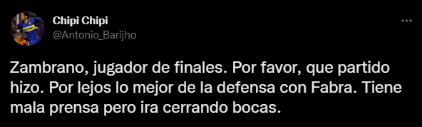 “Zambrano, jugador de finales. Por favor, que partido hizo. Por lejos lo mejor de la defensa con Fabra. Tiene mala prensa, pero irá cerrando bocas”. Se puede leer, junto a otras muestras de cariño como: “Zambrano jugó un partidazo, no tengan miedo de reconocerlo”. Así mismo, uno de este estilo, donde se critica a los que solo los que ven el lado negativo del ‘León’: “Insólito, como en esta cloaca hay una cacería injusta contra Zambrano. Es un caudillo”.