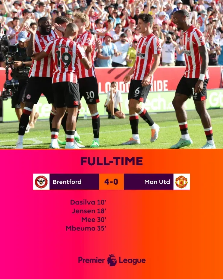 Con el tanto tempranero del Brentford se vio a un Manchester United manitado, por estar abajo en el marcador, y tras un cúmulo de imprecisiones,Mathías Jense marcaría el 2-0 para los locales, gracias a un error en salida de Christian Eriksen. Y eso no sería todo, luego llegaría el tanto deBen Mee (30′) y Bryan Mbeumo (35′) para el 4-0 del Brentford.
