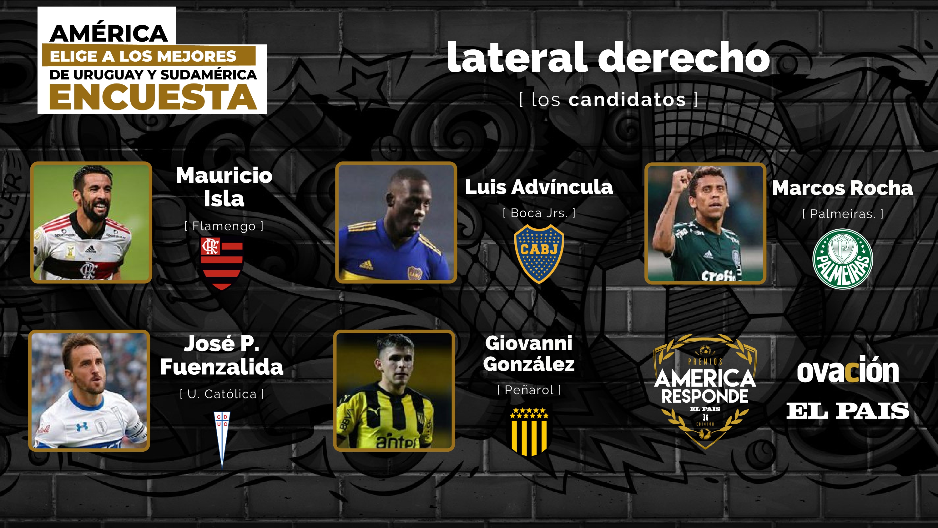 En ese sentido, la distinción de Luis Advíncula todavía es una candidatura pues compite con otros laterales derechos tales como: Mauricio Isla del Flamengo, Marcos Rocha de Palmeiras, José P. Fuenzalida de la Universidad Católica y Giovanni González de Peñarol.Así pues, y si Luis Advíncula resulta ganador de la votación web, formará parte del once ideal del diario El País de Uruguay en la edición 36° de los Premios América Responde. Puedes votar por Luis Advíncula aquí.
