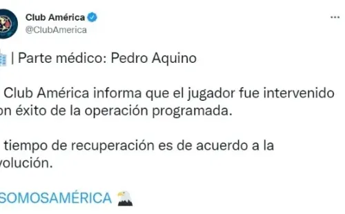 En su cuenta de Twitter los amarillos dijeron: “Parte médico: Pedro Aquino. El club América informa que el jugador fue intervenido con éxito de la operación programada. El tiempo de recuperación es de acuerdo con la evolución”, publicó el América de México en sus redes sociales, después de haber operado satisfactoriamente al volante peruano.