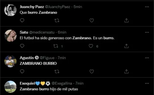 En twitter los insultos a su partido están siendo muy fuertes, con calificativos que no se pueden reproducir porque dañan la integridad del ser humano. Unos van con apelativos al futbolista, otros criticando su falta de reacción, y los demás, comparándolo con un animal de la fauna silvestre.