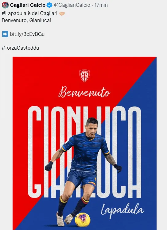 “Lapadula es de Cagliari ¡Bienvenido, Gianluca!”, fue el breve mensaje que dejó el club italiano que disputará la Serie B este año, y espera que de la mano del ‘Bambino’ se logre el objetivo de volver a la Primera División del fútbol de Italia.