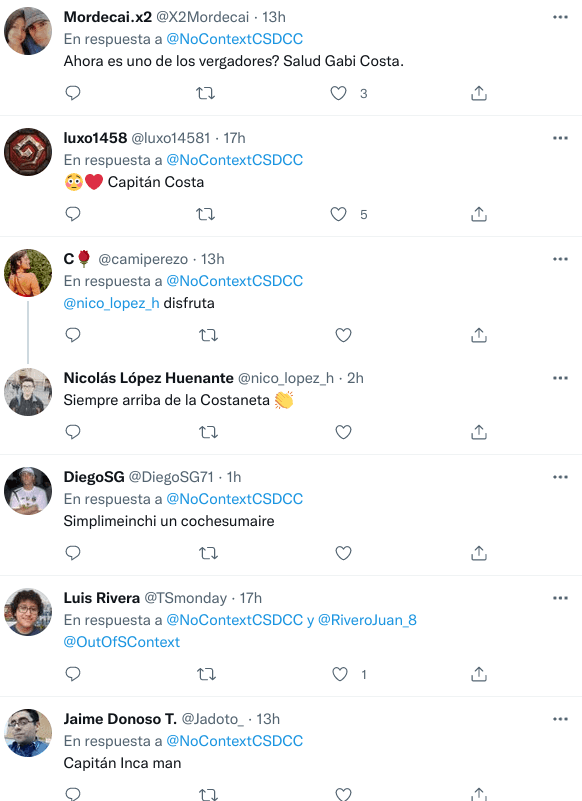 Igual, esto generó una serie de comentarios, sobretodo en Chile, donde milita actualmente. Su imagen fue colocada en Out of Context Colo-Colo y los comentarios y me gusta no tardaron en llegar. Algunos se burlaban, otros le ponían apodos como el Capitán Costa y muchos dieron en el corazoncito¡Un grande Gabigol!