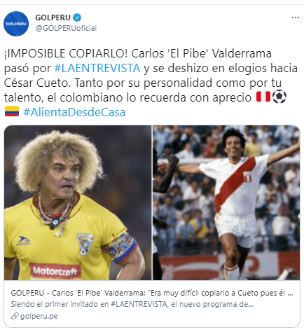 En conversación con GOLPERU. Valderrama sostuvo sobre Cueto lo siguiente: “A César Cueto tuvimos la oportunidad de tenerlo mucho tiempo en Colombia. Lo vimos en los mundiales y luego lo tuvimos cerquita. Siendo mayor, fue uno de los grandes jugadores que vino al fútbol colombiano. Nos dejó enseñanzas”.