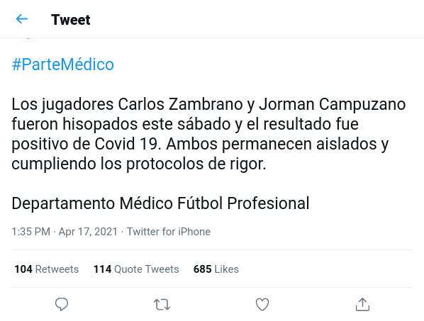 Mediante sus redes sociales, el equipo ‘azul y oro’ notificó lo siguiente: “Los jugadores Carlos Zambrano y Jorman Campuzano fueron hisopados este sábado y el resultado fue positivo de COVID 19. Ambos permanecen aislados y cumpliendo los protocolos de rigor. Departamento Médico Fútbol Profesional”.