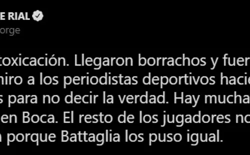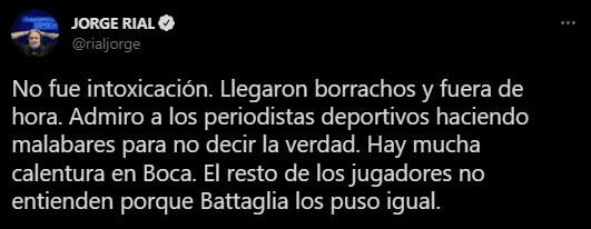 El periodista argentino, Jorge Rial, fue mucho más allá y contó con lujo de detalles lo que pasó: “No fue intoxicación. Llegaron borrachos y fuera de hora. Admiro a los periodistas deportivos haciendo malabares para no decir la verdad. Hay mucha calentura en Boca. El resto de los jugadores no entienden porque Battaglia los puso igual”.
