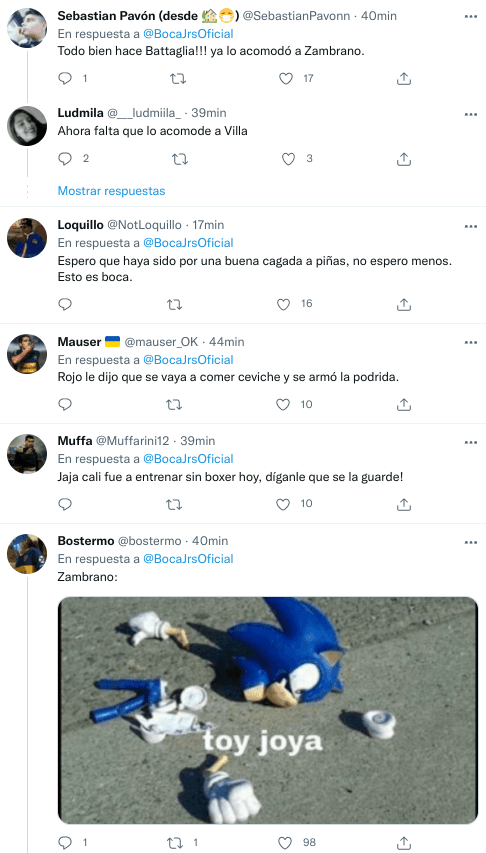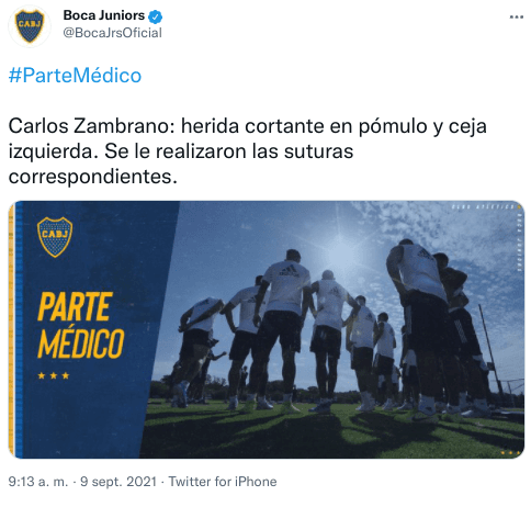 Este jueves, por ejemplo, se conoció que el Kaiser se había lesionado en una práctica. La noticia publicada por la cuenta oficial de Boca era muy particular: “Carlos Zambrano: herida cortante en pómulo y ceja izquierda. Se le realizaron las suturas correspondientes”.