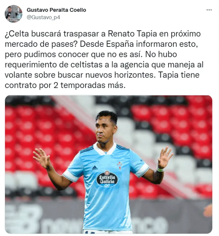 “Desde España informaron esto, pero pudimos conocer que no es así. No hubo requerimiento de celtistas a la agencia que maneja al volante sobre buscar nuevos horizontes. Tapia tiene contrato por 2 temporadas más”, reveló el conocido periodista Gustavo Peralta de ESPN Perú.