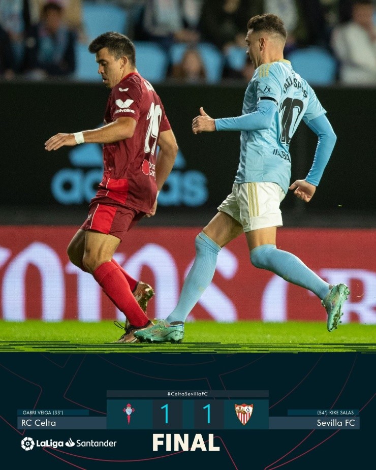 Por parte de la visita, se puede decir que sacaron adelante un cotejo complicado desde todo aspecto. Con un jugador menos, el cuadro de Jorge Sampaoli, se lleva un punto del Estadio de Balaídos. Con mucha gallardía, y bastante amor propio. Aunque en la previa, se le veía como candidato para llevarse el triunfo absoluto.