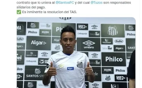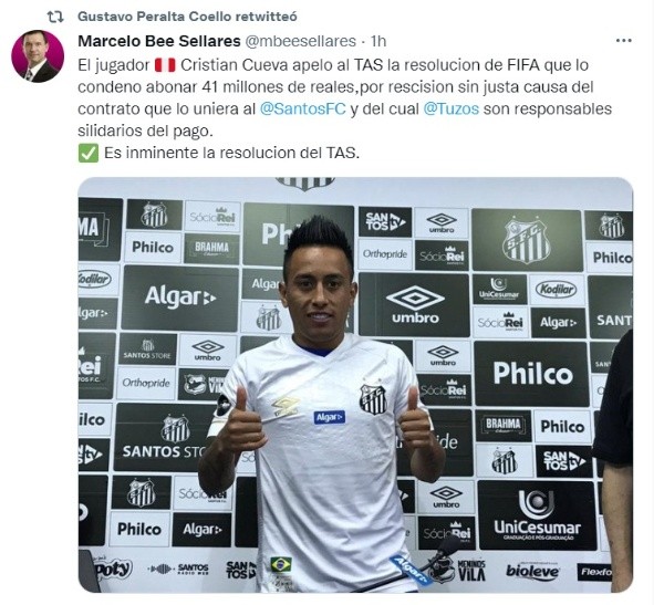 “El jugador peruano Christian Cueva apeló al TAS la resolución de FIFA que lo condenó a abonar 41 millones de reales, por rescisión sin justa causa del contrato que lo uniera al Santos y del cual Pachuca son responsables solidarios del pago. Es inminente la resolución del TAS“, expresó el hombre de prensa en su cuenta de Twitter.