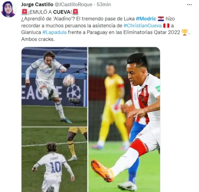 “¿Aprendió de ‘Aladino’? El tremendo pase de Luka Modric hizo recordar a muchos peruanos la asistencia de Christian Cueva a Gianluca Lapadula frente a Paraguay en las Eliminatorias Qatar 2022. Ambos cracks.”, dice otro usuario de esta conocida red social sobre la asistencia de ‘Aladino’.