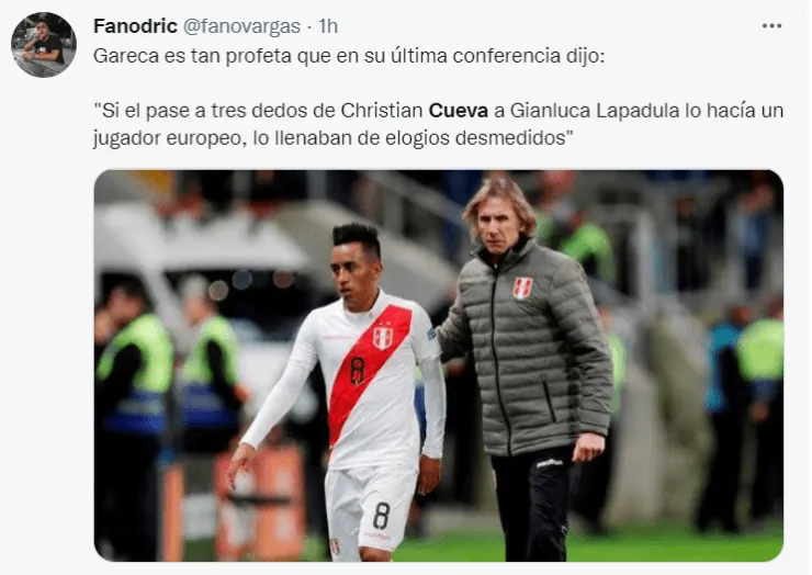 “Gareca es tan profeta que en su última conferencia dijo: “Si el pase a tres dedos de Christian Cueva a Gianluca Lapadula lo hacía un jugador europeo, lo llenaban de elogios desmedidos”, publicó el conocido youtuber peruano’Fanodric’ en su cuenta de Twitter.