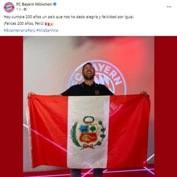 “Hoy cumple 200 años un país que nos ha dado alegría y felicidad por igual. ¡Felices 200 años, Perú!” Fue lo que propuso Bayern Múnich, haciéndose viral de forma inmediata, por la cantidad de seguidores que tiene el Bayern Múnich a lo largo del mundo.