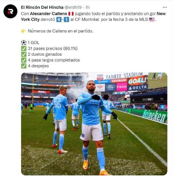 El New York City viene enfrentando al Montreal en la MLS, el equipo en el cual juega el peruano Alexander Callensy que marcha en el séptimo lugar en la tercera fecha del torneo estadounidense. El central es uno de los pilares en el equipo del noruego Ronny Deila y habitual titular en la saga central del cuadro ciudadano, último campeón de la liga.