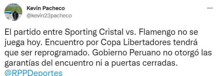Asimismo, el periodista Kevin Pacheco de RPP Noticias agregó:“El partido entre Sporting Cristal vs. Flamengo no se juega hoy. Encuentro por Copa Libertadores tendrá que ser reprogramado. Gobierno Peruano no otorgó las garantías del encuentro ni a puertas cerradas”.