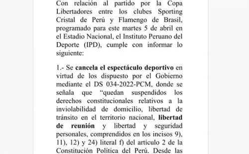 El duelo entre Sporting Cristal y Flamengo (Brasil) por la Conmebol Libertadores 2022 programado para disputarse este martes a las 7:30 p.m. (hora peruana) fue suspendido hasta nuevo aviso por el IPD. Cabe resaltar que el Perú atraviesa por un momento crítico en estos momentos debido al paro de transportistas y protestas contra el Gobierno. Por este motivo, se optó por suspender este encuentro, que marcaba el debut copero del equipo de Roberto Mosquera.