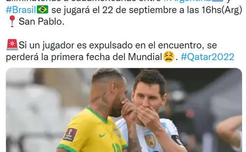 “La FIFA confirmó que el partido pendiente por Eliminatorias a sudamericanas entre Argentina y Brasil se jugará el 22 de septiembre a las 16 hrs(Arg) en San Pablo. Si un jugador es expulsado en el encuentro, se perderá la primera fecha del Mundial Qatar2022”, reveló la periodista Veronica Brunati.