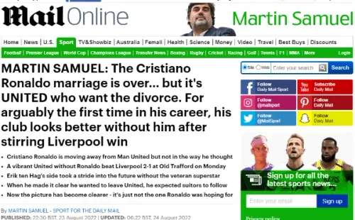 Para este columnista, ‘El Bicho’ está casi fuera de competencia con el nuevo entrenador: “El matrimonio de Cristiano Ronaldo ha terminado… pero es el United quien quiere el divorcio”, inicia en su columna el periodista Martin Samuel. “Por primera vez en su carrera, su club parece mejor sin él tras la conmovedora victoria ante el Liverpool. Paso a paso, partido a partido, Cristiano Ronaldo se aleja del Manchester United, pero no de la manera que él imaginaba”.