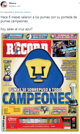 Esta situación la viven hasta los medios de comunicación deportivos de México, aquellos que apoyan a ‘La Máquina Cementera’ por su grandeza, y los que también quieren verlo caer en situaciones finales una vez más. Este podría ser el caso del ‘Diario Récord’.