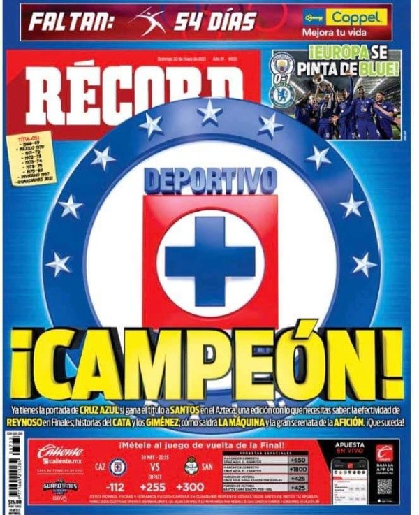 La portada de hoy, que apertura el día del ‘Diario Récord’ señala a Cruz Azul como campeón, sin haberse jugado aún el cotejo en el Estadio Azteca. El equipo de Juan Reynoso hoy puede serlo, pero aún faltan 90 minutos reglamentarios. Sin embargo, la chance está, pero esta revista juega al doble sentido, su baja es muy descriptiva.