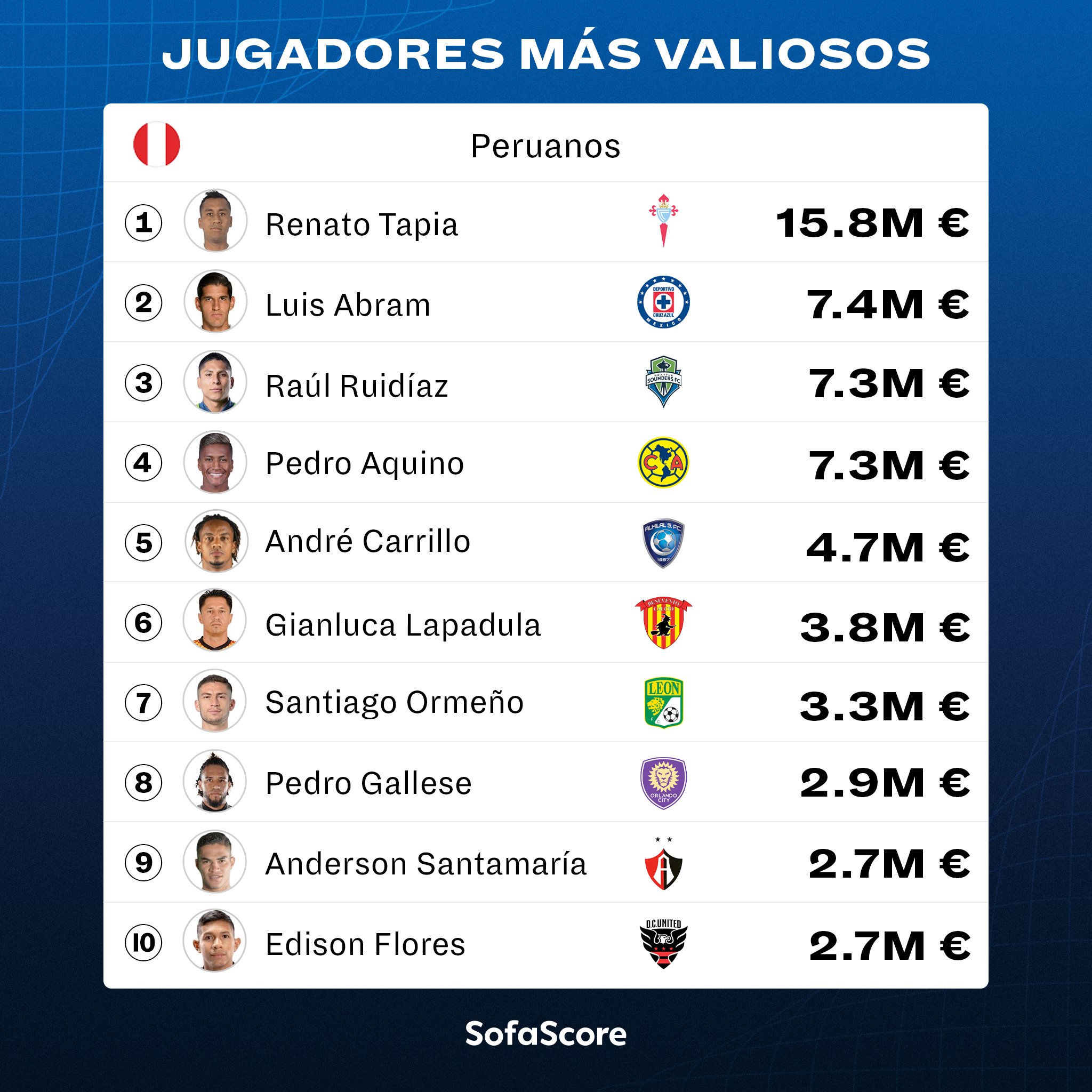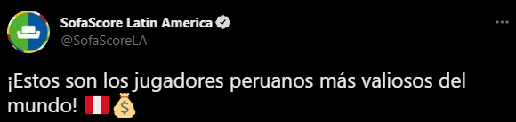 “¡Estos son los jugadores peruanos más valiosos del mundo!”, presentó en su cuenta principal de Twitter ‘SofaScore Latin America’. De ahí en adelante pasamos a destacar la lista completa, la cual es encabezada por Renato Tapia con 15.8 millones de euros (Celta de Vigo). Después está Luis Abram con 7.4 millones de euros (Cruz Azul).