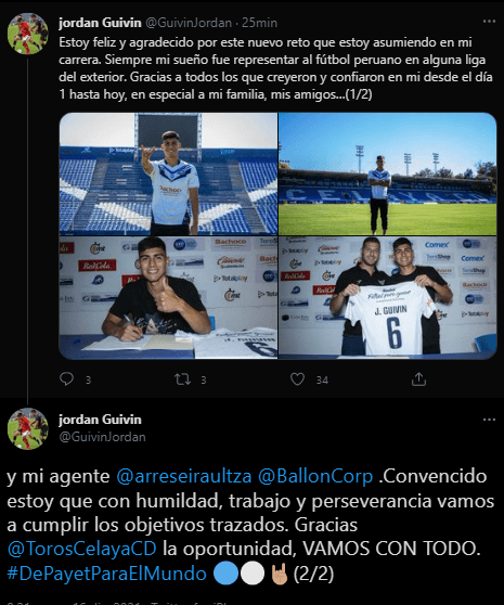 El mensaje del cuadro de Guanajuato fue el siguiente: “¡Bienvenido a los Toros, Jordan Guivin! Llegas a un club donde se entrega el alma y corazón en cada partido, y sabemos que así lo vas a mostrar en la cancha. Mediocampista, 23 años, Perú, 1.70 mts. Equipo anterior: Club Cienciano”.
