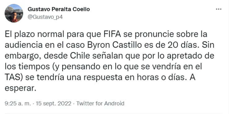 “El plazo normal para que FIFA se pronuncie sobre la audiencia en el caso Byron Castillo es de 20 días. Sin embargo, desde Chile señalan que por lo apretado de los tiempos (y pensando en lo que se vendría en el TAS) se tendría una respuesta en horas o días. A esperar”, reveló el comunicador en su cuenta de Twitter.