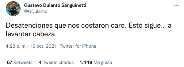 “Desatenciones que nos costaron caro. Esto sigue… a levantar cabeza”,escribió el defensor que puede ser llamado a la Selección Peruana en la próximas lista de Ricardo Gareca. Antes, igual, tendrá otros duelos que enfrentar. La mejor de las suertes para lo que viene.