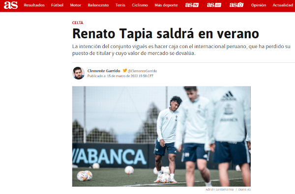 “El Celta le buscará salida a Renato Tapia en el próximo mercado”. Menciona el periodista Clemente Garrido, del ‘Diario As’, con las siguientes afirmaciones que dejan claro el momento de nuestro compatriota: “La intención del conjunto vigués es hacer caja con el internacional peruano, que ha perdido su puesto de titular y cuyo valor de mercado se devalúa”.