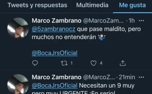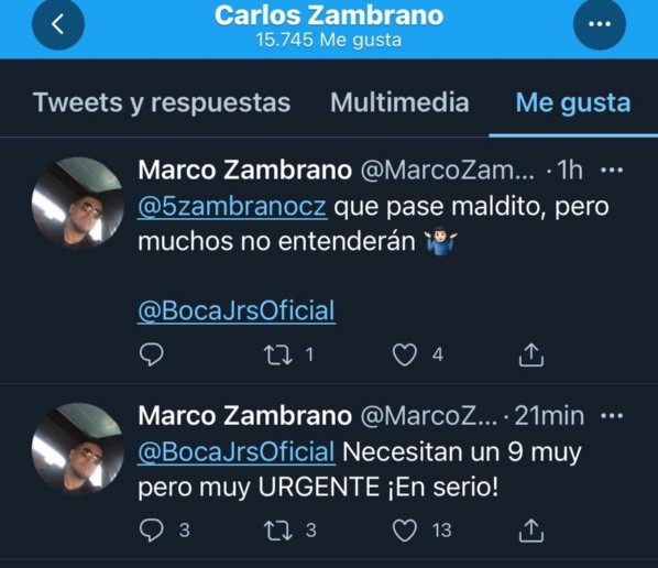 Y es que su hermano Marco Zambrano escribió dos tuits que dieron que hablar por los likes del León. En uno decían queBoca Juniors le faltaba nueve y en el otro valoraba un pase del Kaiser.