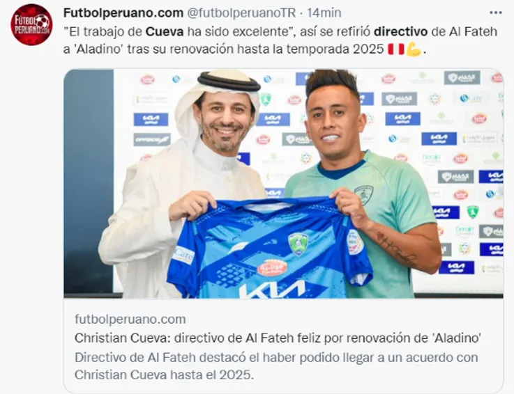 Hace un par de días, Christian Cueva, mediocampista peruano, renovó su contrato con Al-Fatehhasta el 2025. En ese sentido, Hassan Aljaber,miembro de la Junta Directiva del club, dio detalles de la extensión del contrato de ‘Aladino’. Asimismo, resalto el equipo que están conformando para afrontar la siguiente temporada.
