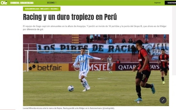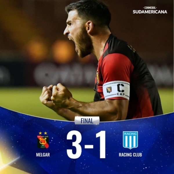 La prensa argentina resaltó la victoria del conjunto ‘Dominó’ pero a su vez rotuló de las siguientes maneras la derrota de ‘La Academia’: “Racing y un duro tropiezo en Perú”, “Melgar derrota a Racing y asume el liderato del grupo B”, “Racing sufrió un duro golpe en Perú y perdió su invicto ante Melgar”, “Racing pierde su invicto en Perú frente a Melgar pero sigue en carrera”, “Racing: el fin de un largo invicto de Gago y hoy afuera de la Sudamericana”.