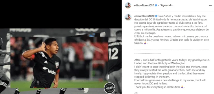 “Tras 2 años y medio inolvidables, hoy me despido del DC United y de la hermosa ciudad de Washington. No quería dejar de agradecer tanto al club como a los fans, puesto que siempre me trataron con mucho cariño, tanto a mí como a mi familia.Agradezco su pasión y que nunca dejaron de creer en el equipo.