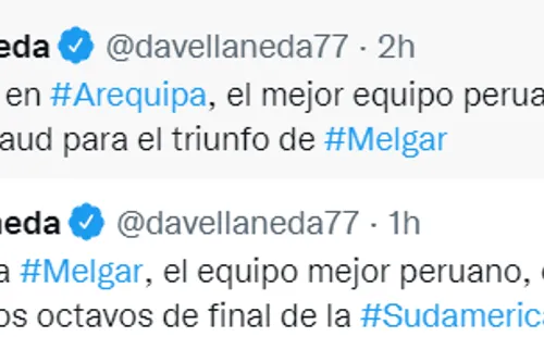 FBC Melgarvenció 3-1 aCuiabáen la UNSA de Arequipa y clasificó a los octavos de final de laConmebol Sudamericanatrasla derrota deRacingen el ‘Cilindro’ a manos deRiver Platede Uruguay (1-0). En ese sentido, el periodista argentino, Daniel Avellaneda, del diario ‘Clarín’, explotó en redes sociales tras la eliminación del conjunto argentino, y al mismo tiempo elogió al equipo arequipeño tras lo mostrado a lo largo del torneo.