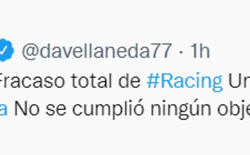 “No se puede creer. Fracaso total de Racing. Una vergüenza quedar afuera de la Sudamericana. No se cumplió ningún objetivo, pero ‘el equipo juega bien’. Tómenselas”, fue el polémico mensaje publicado por el conocido periodista argentino.