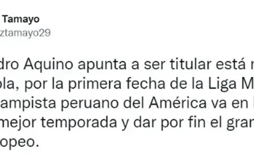 Pedro Aquino es una pieza importante en el esquema de Santiago Solari en el América. El volante de primera línea de la Selección Peruana viene de recuperarse de una lesión que tuvo en un partido con la ‘blanquirroja’ algo que enfureció a la directiva del cuadro mexicano, pero hoy, tras haber superado la molestia, el futbolista apunta a dar lo mejor en el primer partido del año con las ‘Águilas’.