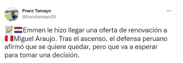 El periodista Franz Tamayo publicó en su cuenta de Twitter información sobre Miguel Araujo y su posible renovación con el cuadro de países bajos: “ Emmen le hizo llegar una oferta de renovación a Miguel Araujo. Tras el ascenso, el defensa peruano afirmó que se quiere quedar, pero que va a esperar para tomar una decisión”, así dijo el comunicador en sus redes sociales sobre el peruano.