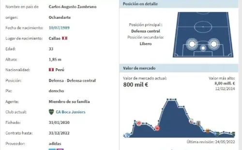 Comenzando por lo netamente deportivo, el defensor peruano Carlos Zambrano tiene contrato con Boca Juniors hasta diciembre del 2022. Tasado por la página Transfermarkt en 800 mil dólares, el club xeneize lo adquirió en 1 millón 50 mil dólares, pero difícilmente pueda ver retribuida la inversión.