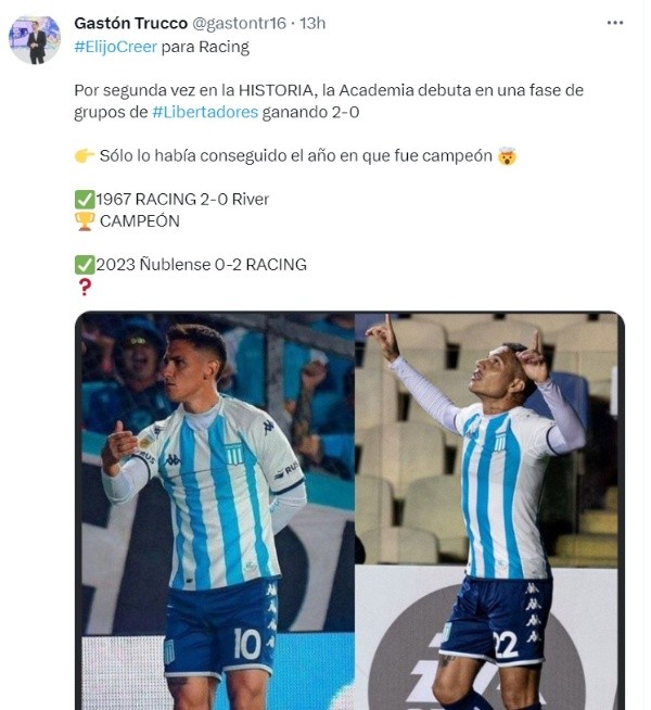 Resulta que solo una vez en su historia Racing Club había podido empezar la Copa Libertadores ganando de visita. Fue en el año de 1967, edición en la que venció a River Plate y en la que terminó siendo campeón. Se volverá a repetir la historia en este 2023, ya que nuevamente ha empezado ganando de visita.