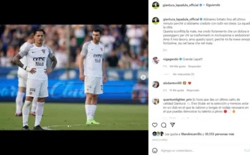 Tras la derrota y eliminación de cara a su camino por ascender a la Serie A, Gianluca Lapadula publicó un sentido mensaje en sus redes sociales: “Luchamos hasta el último minuto porque creíamos en ello con todo nuestro ser. El equipo y la ciudad”, fue parte de lo que puso el atacante de la Selección Peruana en su cuenta de Instagram, plasmando lo difícil que fue ese momento para él.
