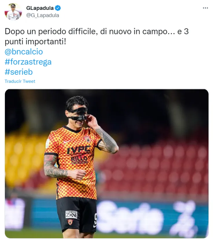 “Después de un muy período difícil, de vuelta en el terreno de juego… y 3 puntos importantes!”, fue el mensaje publicado por Lapadula en su cuenta oficial de Twitter tras conseguir volver a disputar minutos con el Benevento.