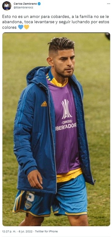 “Esto no es un amor para cobardes, a la familia no se le abandona, toca levantarse y seguir luchando por estos colores”, colocó el defensor peruano de Boca Juniors Carlos Zambrano en su cuenta de Twitter, luego de quedar fuera de la Copa Libertadores a manos de Corinthians.