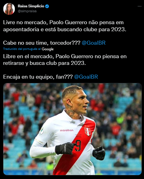 Ante toda esta incertidumbre, una encuesta popular hecha por la periodista brasileña, Raisa Simplicio, de Goal BR, se hizo popular en las redes sociales. Donde la consulta era clara: “Libre en el mercado, Paolo Guerrero no piensa en retirarse y busca club para 2023. ¿Encaja en tu equipo, fan?”.