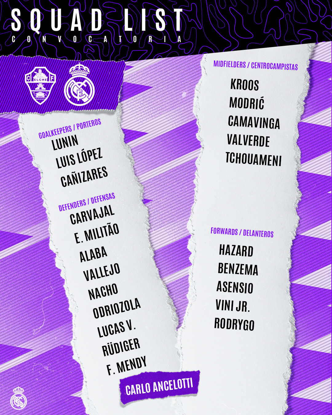 XI REAL MADRID: Lunin; Mendy, Rudiger, Militao, Lucas; Kroos, Tchouameni, Camavinga; Asensio, Benzema, Rodrygo.