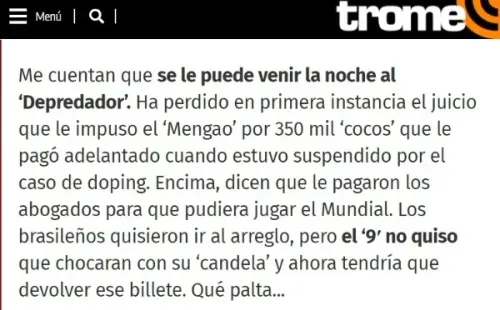 “Me cuentan que se le puede venir la noche al ‘Depredador’. Ha perdido en primera instancia el juicio que le impuso el ‘Mengao’ por 350 mil ‘cocos’ que le pagó adelantado cuando estuvo suspendido por el caso de doping. Encima, dicen que le pagaron los abogados para que pudiera jugar el Mundial. Los brasileños quisieron ir al arreglo, pero el ‘9′ no quiso que chocaran con su ‘candela’ y ahora tendría que devolver ese billete. Qué palta“, refiere el popular Bombardero en su columna del Diario Trome.