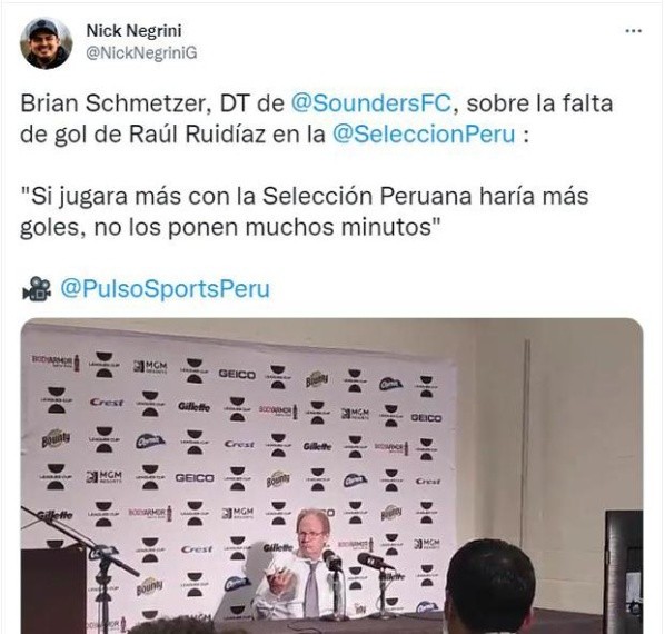 Lo cual se podría tomar como un comentario ligero, pero se debe tomar en cuenta, porque no hay mejor profesional que conozca a Raúl Ruidíaz, que el propio Brian Schmetzer. El entrenador del Seattle Sounders. Entonces, todo queda en la cancha de Ricardo Gareca, si lo asume como tal, o finalmente lo deja pasar.
